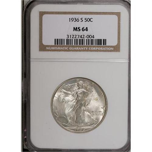<B>1936-S 50C MS64 NGC.</B></I> NGC Census: (374/590). PCGS Population (638/829). Mintage: 3,884,000. Numismedia Wsl. Price for NGC/PCGS coin in MS64: $210. (#6600)<BR><BR><B>Coin Engraver:</B> Adolph A. Weinman<BR><BR><b>Shipping:</b> Coins & Currency (<a target="_blank" href="http://www.heritageauctions.com/common/shipping.php">view shipping information</a>)