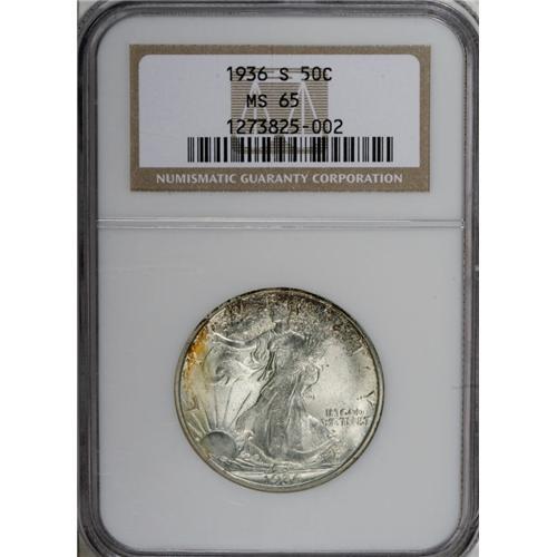 <B>1936-S 50C MS65 NGC.</B></I> A luminous example with arcs of tan and russet patina at the upper periphery on the obverse and right periphery on the reverse. Lustrous and splendidly preserved with pleasing detail on Liberty's head.<BR><BR><b>Shipping:</b> Coin/Currency (<a target="_blank" href="http://www.heritageauctions.com/common/shipping.php">view shipping information</a>)