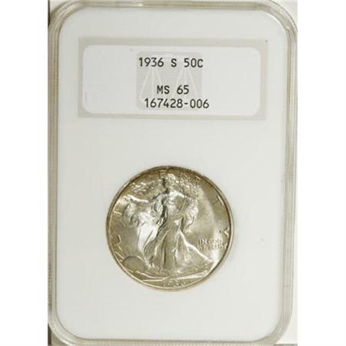 <B>1936-S 50C MS65 NGC.</B></I> Light golden-brown toning visits the margins of this lustrous example. Liberty's head and skirt lines are sharply struck. Encased in a former generation holder.<BR><I>Ex: ANA Bullet (Heritage, 8/98), lot 595.</B></I><BR><BR><B>Coin Engraver:</B> Adolph A. Weinman<BR><BR><b>Shipping:</b> Coins & Currency (<a target="_blank" href="http://www.heritageauctions.com/common/shipping.php">view shipping information</a>)