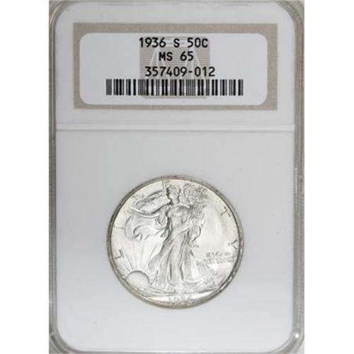 <B>1936-S 50C MS65 NGC.</B></I> Streaks of tan-gold toning endow this lustrous Gem. Liberty's head is well struck, while the branch hand shows blending of detail. Housed in a prior generation holder.<BR><BR><B>Coin Engraver:</B> Adolph A. Weinman<BR><BR><b>Shipping:</b> Coins & Currency (<a target="_blank" href="http://www.heritageauctions.com/common/shipping.php">view shipping information</a>)