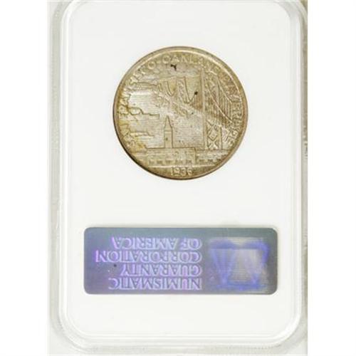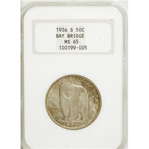 <B>1936-S 50C Bay Bridge MS65 NGC.</B></I> Soft orange and pinkish-violet patina drapes the subtly lustrous surfaces of this well struck Bay Bridge half. This well-preserved representative shows small dots of deeper toning at the margins.<BR><BR><b>Shipping:</b> Coins & Currency (<a target="_blank" href="http://www.heritageauctions.com/common/shipping.php">view shipping information</a>)