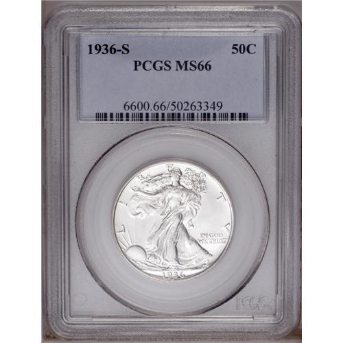 <B>1936-S<50C> MS66 PCGS.</B></I> Bright silvery surfaces are radiantly lustrous and immaculately preserved. The strike is well executed, including excellent definition on Liberty's left hand area and on the gown lines. A truly sharp coin with great eye appeal. PCGS has certified only five specimens finer (1/06).