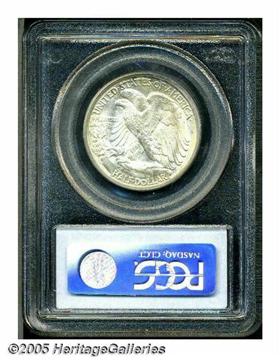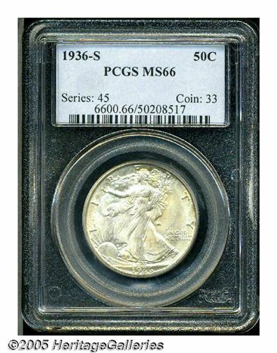 <B>1936-S<50C> MS66 PCGS.</B></I> Lustrous surfaces display wisps of pastel champagne-gold, lavender, and ice-blue patination. The design elements are generally adequately struck, though the areas of Liberty's left hand are weak. The tops of the 3 and 6 in the date also exhibit softness. There are no significant contact marks to report.