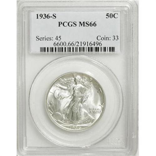 <B>1936-S 50C MS66 PCGS.</B></I> PCGS Population (182/5). NGC Census: (137/9). Mintage: 3,884,000. Numismedia Wsl. Price for NGC/PCGS coin in MS66: $1,575. (#6600)<BR><BR><B>Coin Engraver:</B> Adolph A. Weinman<BR><BR><b>Shipping:</b> Coins & Currency (<a target="_blank" href="http://www.heritageauctions.com/common/shipping.php">view shipping information</a>\)