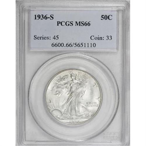 <B>1936-S 50C MS66 PCGS.</B></I> Pleasing satiny surfaces emit a lustrous glow, and reveal just a few light, unobtrusive ticks. The design elements are generally well impressed, but Liberty's branch hand is typically weak. <BR><I>From The Mario Eller Collection, Part Two.</B></I><BR><BR><B>Coin Engraver:</B> Adolph A. Weinman<BR><BR><b>Shipping:</b> Coins & Currency (<a target="_blank" href="http://www.heritageauctions.com/common/shipping.php">view shipping information</a>)
