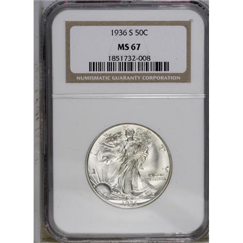 <B>1936-S<50C> MS67 NGC.</B></I> This example is tied for the finest certified by either NGC or PCGS. It has brilliant snow-white surfaces and a pleasing satiny sheen. All of the design elements on each side are sharply struck except for Liberty's hand at the center of the obverse, which is a trifle weak. Clearly an important opportunity is presented to the specialist. Census: 8 in 67, 0 finer at either service (8/06).