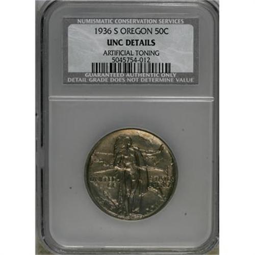 <B>1936-S 50C Oregon--Artificially Toned--NCS. UNC Details.</B></I> NGC Census: (0/981). PCGS Population (0/1459). Mintage: 5,006. Numismedia Wsl. Price for NGC/PCGS coin in MS60: $150. (#9346)<BR><BR><b>Shipping:</b> Coins & Currency (<a target="_blank" href="http://www.heritageauctions.com/common/shipping.php">view shipping information</a>)