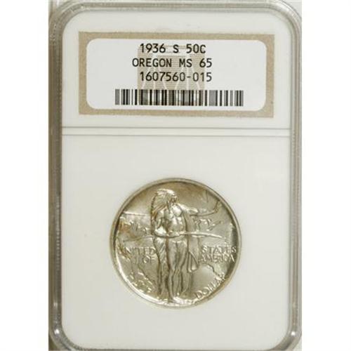 <B>1936-S 50C Oregon MS65 NGC.</B></I> NGC Census: (294/519). PCGS Population (468/468). Mintage: 5,006. Numismedia Wsl. Price for NGC/PCGS coin in MS65: $280. (#9346)<BR><BR><b>Shipping:</b> Coins & Currency (<a target="_blank" href="http://www.heritageauctions.com/common/shipping.php">view shipping information</a>)