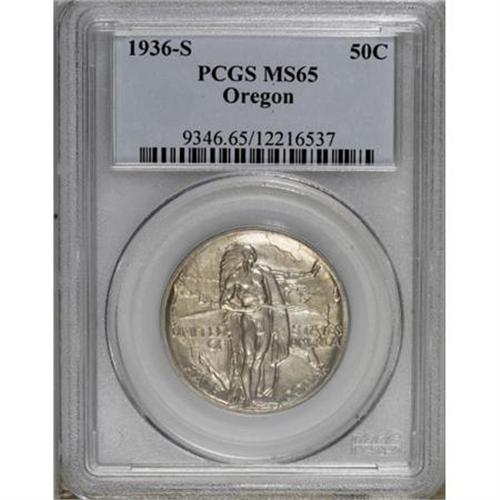 <B>1936-S 50C Oregon MS65 PCGS.</B></I> . PCGS Population (482/489). NGC Census: (299/529). Mintage: 5,006. Numismedia Wsl. Price for NGC/PCGS coin in MS65: $280. (#9346)<BR><BR><b>Shipping:</b> Coins & Currency (<a target="_blank" href="http://www.heritageauctions.com/common/shipping.php">view shipping information</a>)
