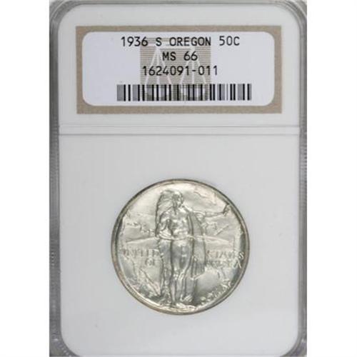 <B>1936-S 50C Oregon MS66 NGC.</B></I> NGC Census: (384/140). PCGS Population (369/118). Mintage: 5,006. Numismedia Wsl. Price for NGC/PCGS coin in MS66: $400. (#9346)<BR><BR><b>Shipping:</b> Coins & Currency (<a target="_blank" href="http://www.heritageauctions.com/common/shipping.php">view shipping information</a>)