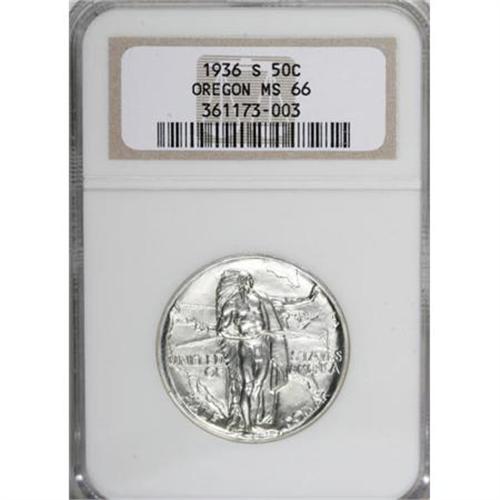 <B>1936-S 50C Oregon MS66 NGC.</B></I> NGC Census: (384/140). PCGS Population (369/118). Mintage: 5,006. Numismedia Wsl. Price for NGC/PCGS coin in MS66: $400. (#9346)<BR><BR><b>Shipping:</b> Coins & Currency (<a target="_blank" href="http://www.heritageauctions.com/common/shipping.php">view shipping information</a>)