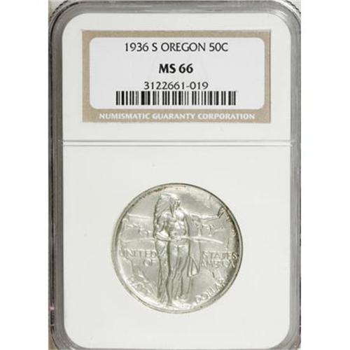 <B>1936-S 50C Oregon MS66 NGC.</B></I> . NGC Census: (387/142). PCGS Population (369/118). Mintage: 5,006. Numismedia Wsl. Price for NGC/PCGS coin in MS66: $400. (#9346)<BR><BR><b>Shipping:</b> Coins & Currency (<a target="_blank" href="http://www.heritageauctions.com/common/shipping.php">view shipping information</a>)