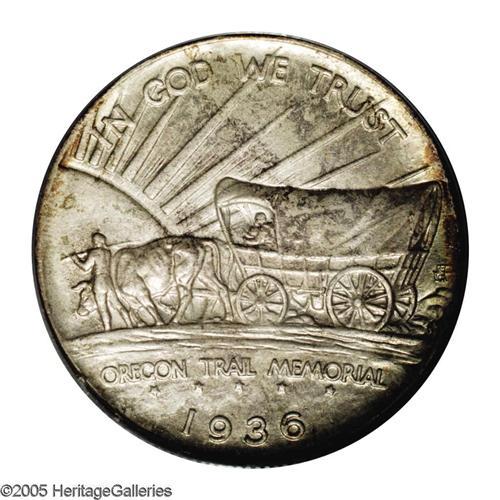 <B>1936-S<50C> Oregon MS66 PCGS.</B></I> Lustrous surfaces are bathed in grayish-gold color, that yield to a deep golden-brown around portions of the borders. The design elements are sharply struck throughout, and the surfaces are devoid of significant marks.