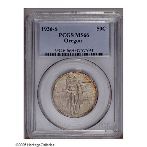 1936-S 50C Oregon MS66 PCGS. Lustrous surfaces are bat 1936-S[50C] Oregon MS66 PCGS.
