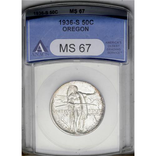 1936-S 50C Oregon MS67 ANACS. Typically bold with silk 1936-S[50C] Oregon MS67 ANACS.