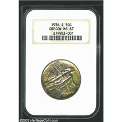 1936-S 50C Oregon MS67 NGC. Yellow-green and lilac colors dominate, with scattered freckles of russet patina at the borders. A well struck Superb Gem that has moderate luster and essentially pristine surfaces. The obverse has a tripled die, perhaps most noticeable on the crossbar of the A in DOLLAR. Just 5,006 pieces were struck. Important notice: We expect to be auctioning lots at the rate of 200-250 per hour. Sometimes eBay Premier live bid software cannot keep up with that pace, so we strongly recommend that you place a realistic proxy bid now as insurance to avoid disappointment. Also please note that all Heritage/CAA lots purchased through eBay Premier carry a 20% Buyer's Premium. Please make sure you read the Terms and Conditions.