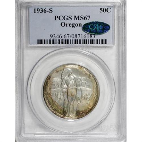 <B>1936-S 50C Oregon MS67 PCGS. CAC.</B></I> An intricately struck Superb Gem has satiny luster and original chestnut-gold, orange-red, and forest-green patina. The preservation is exceptional. Only 5,006 pieces were struck.<BR><I>From The Good Humor Collection.</B></I><BR><BR><b>Shipping:</b> Coins & Currency (<a target="_blank" href="http://www.heritageauctions.com/common/shipping.php">view shipping information</a>)