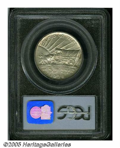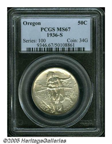 <B>1936-S<50C> Oregon MS67 PCGS.</B></I> Well struck with satiny, untoned surfaces that seem very, very near to being entirely pristine. A lovely high grade example of this elegantly designed commemorative type. Population: 101 in 67, 3 finer (5/05).