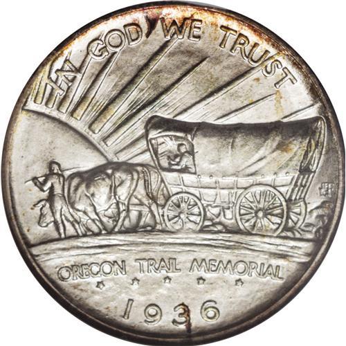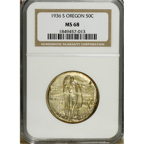 <B>1936-S 50C Oregon MS68 NGC.</B></I> This is a gorgeous Superb Gem with olive-gold color over satiny silver luster on both sides. Traces of peripheral rose, lilac, and iridescent toning can be seen near the borders. This low-mintage (5,006) issue is rather elusive in high quality. Census: 10 in 68, 0 finer (1/07).<BR><BR><b>Shipping:</b> Coins & Currency (<a target="_blank" href="http://www.heritageauctions.com/common/shipping.php">view shipping information</a>)