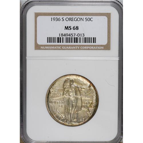<B>1936-S 50C Oregon MS68 NGC.</B></I> This is a gorgeous Superb Gem with olive-gold color over satiny silver luster on both sides. Traces of peripheral rose, lilac, and iridescent toning can be seen near the borders. This low-mintage (5,006) issue is rather elusive in high quality. Census: 10 in 68, 0 finer (4/07).<BR><BR><b>Shipping:</b> Coins & Currency (<a target="_blank" href="http://www.heritageauctions.com/common/shipping.php">view shipping information</a>)