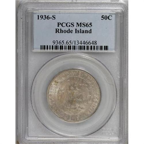 <B>1936-S 50C Rhode Island MS65 PCGS.</B></I> PCGS Population (646/209). NGC Census: (549/165). Mintage: 15,000. Numismedia Wsl. Price for NGC/PCGS coin in MS65: $244. (#9365)<BR><BR><b>Shipping:</b> Coins & Currency (<a target="_blank" href="http://www.heritageauctions.com/common/shipping.php">view shipping information</a>)