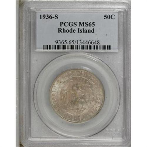 <B>1936-S 50C Rhode Island MS65 PCGS.</B></I> PCGS Population (656/217). NGC Census: (552/164). Mintage: 15,000. Numismedia Wsl. Price for NGC/PCGS coin in MS65: $220. (#9365)<BR><BR><b>Shipping:</b> Coins & Currency (<a target="_blank" href="http://www.heritageauctions.com/common/shipping.php">view shipping information</a>)