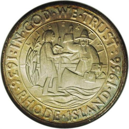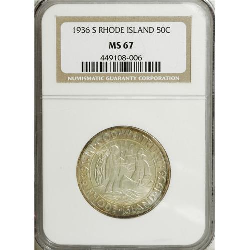 <B>1936-S 50C Rhode Island MS67 NGC.</B></I> The stylized obverse of this commemorative issue seems to have equal numbers of supporters and detractors, and while some may dislike the simplified and low-relief appearance of that side, others admire it for how different it is compared to other contemporary commemoratives. Regardless of artistic taste, it is difficult to disapprove of this well struck coin's preservation. The surfaces display soft, pleasing luster and swirls of sky-blue and gold patina. NGC has certified just 13 pieces in this grade, with two assigned the Star designation and none numerically finer (3/07).<BR><BR><b>Shipping:</b> Coins & Currency (<a target="_blank" href="http://www.heritageauctions.com/common/shipping.php">view shipping information</a>)