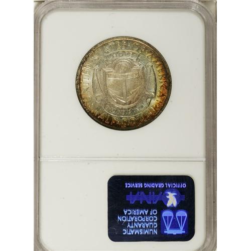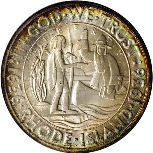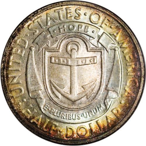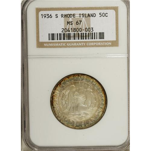 <B>1936-S 50C Rhode Island MS67 NGC.</B></I> This shimmering and slightly satiny Superb Gem showcases the distinctive design of the Rhode Island halves, rendered by stonecutter John Howard Benson and silversmith Arthur Graham Carey in their only attempt at commemorative coin design. Orange-gold at the rims fades to bands of aqua-cyan, which give way to rose-gray centers in turn. Of the 14 examples graded MS67 by NGC, only three received the Star designation, and neither NGC nor PCGS has certified an MS68 or finer piece (3/07).<BR><I>From The Cary & Cheryl Porter Collection.</B></I><BR><BR><b>Shipping:</b> Coins & Currency (<a target="_blank" href="http://www.heritageauctions.com/common/shipping.php">view shipping information</a>)