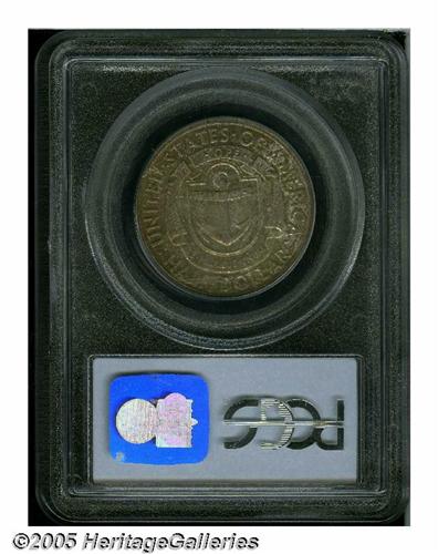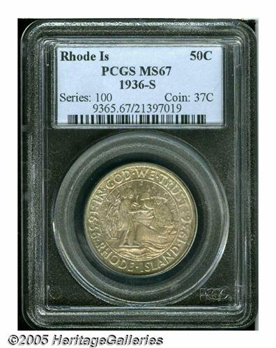 <B>1936-S<50C> Rhode Island MS67 PCGS.</B></I> A silky smooth Rhode Island with pale lilac and pastel-rose obverse toning, intensifying several shades on the reverse into orange, green, and bright rose iridescence. A one-of-a-kind '36-S Rhode Island that is bound to excite the color commemorative specialist. Population: 9 in 67, 0 finer (5/05).<BR><I>From The Western Hills Collection.</B></I>