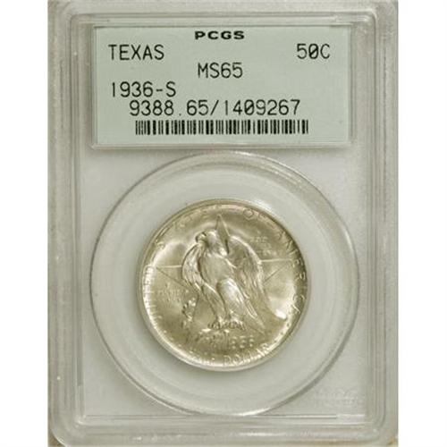 <B>1936-S 50C Texas MS65 PCGS.</B></I> PCGS Population (801/459). NGC Census: (455/504). Mintage: 9,055. Numismedia Wsl. Price for NGC/PCGS coin in MS65: $292. (#9388)<BR><BR><b>Shipping:</b> Coins & Currency (<a target="_blank" href="http://www.heritageauctions.com/common/shipping.php">view shipping information</a>)