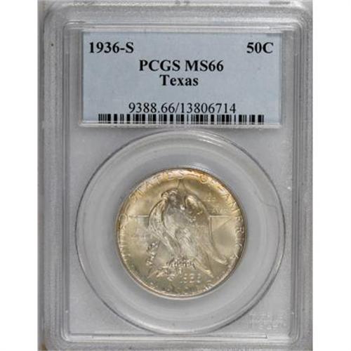 <B>1936-S 50C Texas MS66 PCGS.</B></I> PCGS Population (376/54). NGC Census: (442/57). Mintage: 9,055. Numismedia Wsl. Price for NGC/PCGS coin in MS66: $340. (#9388)<BR><BR><b>Shipping:</b> Coins & Currency (<a target="_blank" href="http://www.heritageauctions.com/common/shipping.php">view shipping information</a>)