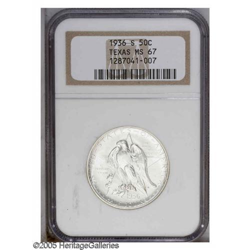 1936-S 50C Texas MS67 NGC. This lustrous Superb Gem is 1936-S[50C] Texas MS67 NGC.