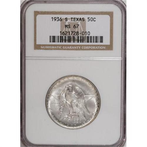 <B>1936-S 50C Texas MS67 NGC.</B></I> A brilliant Superb Gem that has clean surfaces and only the slightest softness of strike on the hand and knee of the Winged Victory. Elusive in this lofty grade and extremely rare any finer, with just four such coins graded by NGC (1/08).<BR><BR><b>Shipping:</b> Coins & Currency (<a target="_blank" href="http://www.heritageauctions.com/common/shipping.php">view shipping information</a>)