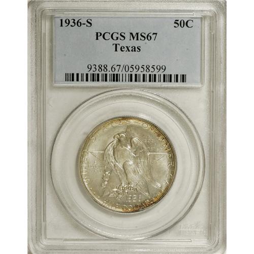 1936-S 50C Texas MS67 PCGS. Glimpses of fire-red enliv
