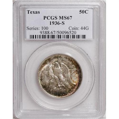 <B>1936-S 50C Texas MS67 PCGS.</B></I> The steel-gray and lilac centers are surrounded by golden-brown and emerald-green peripheries. A well preserved Superb Gem with only slight incompleteness on the knee of the Winged Victory.<BR><I>From The Cary & Cheryl Porter Collection, Part Three.</B></I><BR><BR><b>Shipping:</b> Coins & Currency (<a target="_blank" href="http://www.heritageauctions.com/common/shipping.php">view shipping information</a>\)