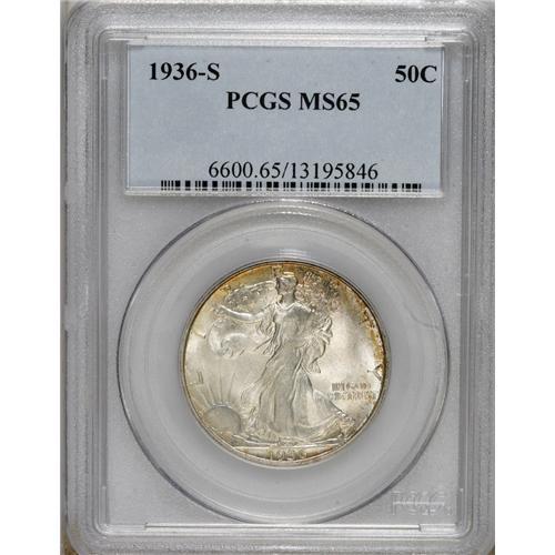 <B>1936-S 50C MS65 PCGS.</B></I> Highly lustrous surfaces display golden-brown patination at the borders, slightly more prominent on the obverse. Liberty's gown lines are sharply delineated, an unusual trait for this issue, whereas Liberty's left (right facing) hand area exhibits the typical weakness. Neither side reveals disturbing blemishes.<BR><BR><b>Shipping:</b> Coins & Currency (<a target="_blank" href="http://www.heritageauctions.com/common/shipping.php">view shipping information</a>) <BR><BR><B>
