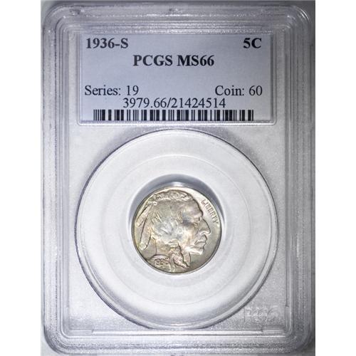 <B>1936-S 5C MS66 PCGS.</B></I> Iridescent rainbow coloration is noted on each side of this well struck Premium Gem. Lustrous and carefully preserved, the coin is nearly pristine.<BR><BR><b>Shipping:</b> Coin/Currency (<a target="_blank" href="http://www.heritageauctions.com/common/shipping.php">view shipping information</a>)
