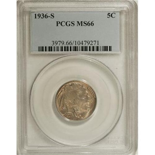 <B>1936-S 5C MS66 PCGS.</B></I> PCGS Population (527/54). NGC Census: (321/38). Mintage: 14,930,000. Numismedia Wsl. Price for NGC/PCGS coin in MS66: $180. (#3979)<BR><BR><b>Shipping:</b> Coins & Currency (<a target="_blank" href="http://www.heritageauctions.com/common/shipping.php">view shipping information</a>)