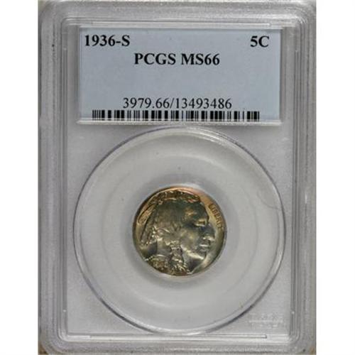 <B>1936-S 5C MS66 PCGS.</B></I> PCGS Population (540/58). NGC Census: (322/40). Mintage: 14,930,000. Numismedia Wsl. Price for NGC/PCGS coin in MS66: $180. (#3979)<BR><BR><B>Coin Engraver:</B> James E. Fraser<BR><BR><b>Shipping:</b> Coins & Currency (<a target="_blank" href="http://www.heritageauctions.com/common/shipping.php">view shipping information</a>)