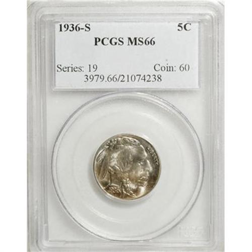 <B>1936-S 5C MS66 PCGS.</B></I> PCGS Population (553/57). NGC Census: (331/35). Mintage: 14,930,000. Numismedia Wsl. Price for NGC/PCGS coin in MS66: $180. (#3979)<BR><BR><B>Coin Engraver:</B> James E. Fraser<BR><BR><b>Shipping:</b> Coins & Currency (<a target="_blank" href="http://www.heritageauctions.com/common/shipping.php">view shipping information</a>)