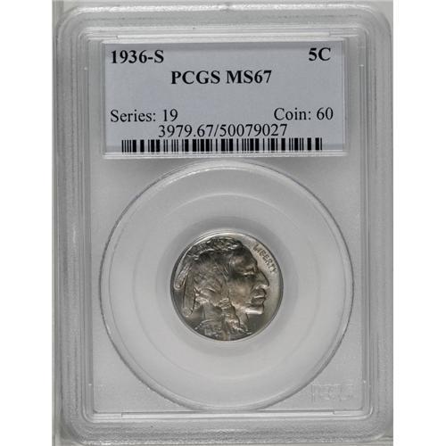 <B>1936-S<5C> MS67 PCGS.</B></I> An exquisitely preserved S-mint Buffalo nickel with liberal amounts of mint frost and delicate sky-blue overtones. Population: 55 in 67, 0 finer (3/06).<BR><I>From The Alex & Nan Registry Sets.</B></I> <BR><BR><B>Important notice:</B> Heritage usually auctions material at the rate of 200-250 lots per hour. On some occasions eBay Live bid software or the Internet may not be able to keep up with the pace of the auction. We recommend placing a realistic absentee bid now as insurance to avoid disappointment. Occasionally the auctioneer may eliminate or reject an eBay Live bid, and the auctioneer may also reopen a lot after the close of the eBay live bidding (usually because we missed an audience bid), and may reject your bid even if it shows you as the winning bidder. By bidding via eBay Live, you agree that Heritage may award the lot to another bidder at its sole discretion under the circumstances described above or any other reasonable circumstances. Since eBay bids are not shown to us until we open the lot on the floor, we treat those bids just like floor bids. In most cases the floor responds before the eBay bid is presented to us, due to Internet lag time, so for consistency we have made it a policy that floor bids are always considered first over tie eBay live bids. Also please note that all Heritage lots purchased through eBay Live carry a 20% Buyer's Premium. Please make sure you read the Terms and Conditions before you bid. This lot is being auctioned in conjunction with a live floor auction by Heritage Galleries & Auctioneers. All final auction and invoice information will be supplied by Heritage Galleries & Auctioneers, and all other information should be considered preliminary. Lot:1126 <BR><BR><B>Winning Notification and Billing:</B> After the FINAL session in this auction is complete, Heritage will send e-mail and snail mail invoices. This process normally takes several days. All final auction and invoice information will be supplied by Heritage Galleries & Auctioneers, and all other information should be considered preliminary. <BR><BR>This auction will be conducted on a live auction floor and over the Internet through eBay Live. If you choose to place an absentee bid, please take a moment to <font color='#0000ff'><u><a href='http://pages.ebay.com/liveauctions/help/before/laabsentee.html'>learn how eBay Live absentee bidding works</a></u></font><font color='#000000'>