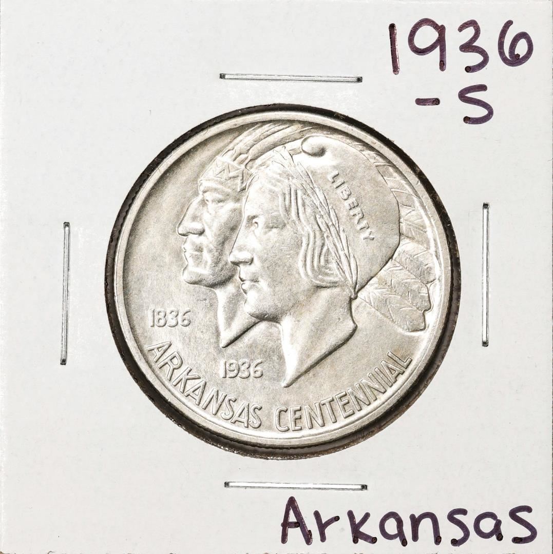 One 1936-S Arkansas Centennial Commemorative Half Dollar Coin.