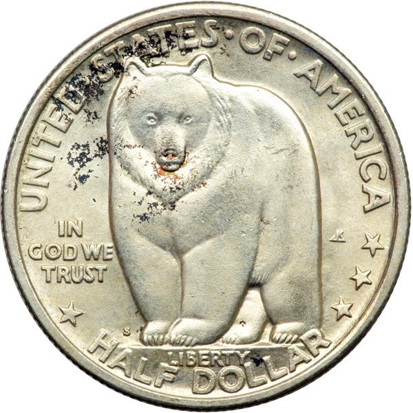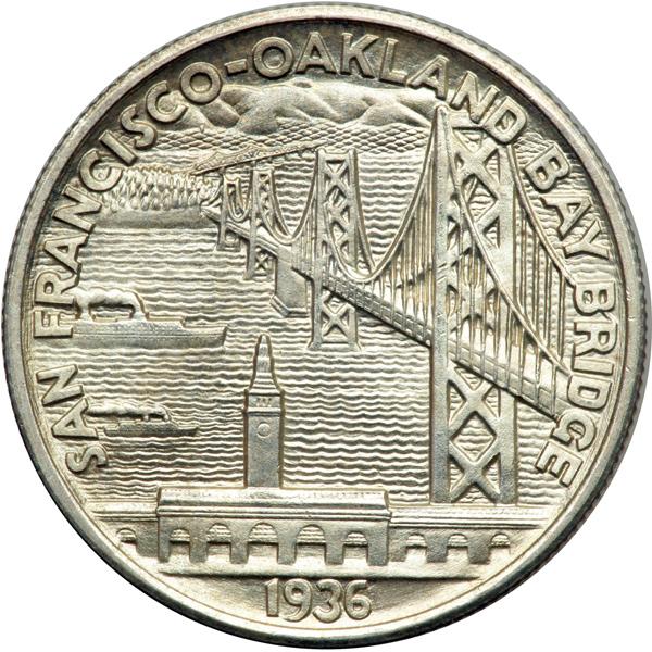 1936-S Bay Bridge Half Dollar. PCGS graded MS-64. Lightly toned with some heavy toning on the obverse. A nice frosty coin (PCGS # 9254) .