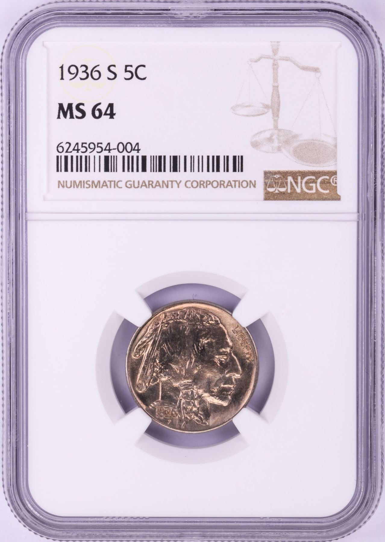 One 1936-S Buffalo Nickel Coin NGC MS64.