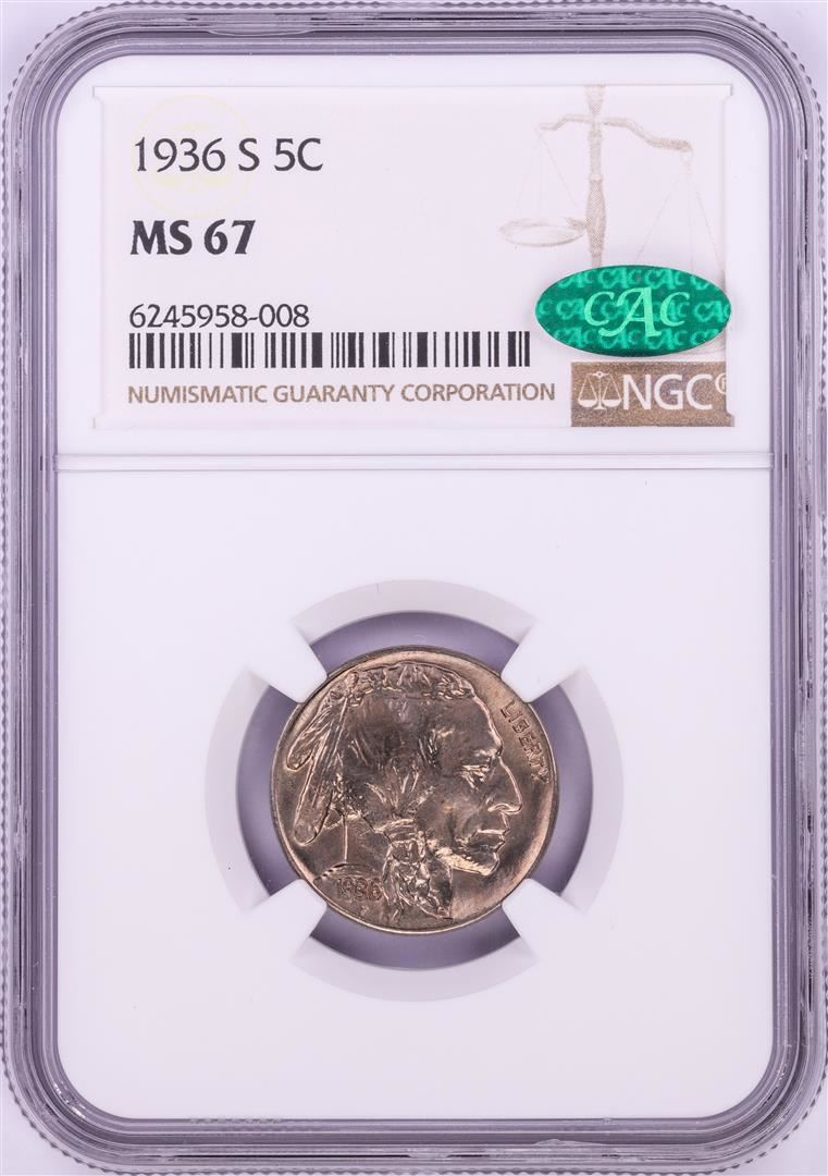 One 1936-S Buffalo Nickel Coin NGC MS67 CAC. NGC Certified.