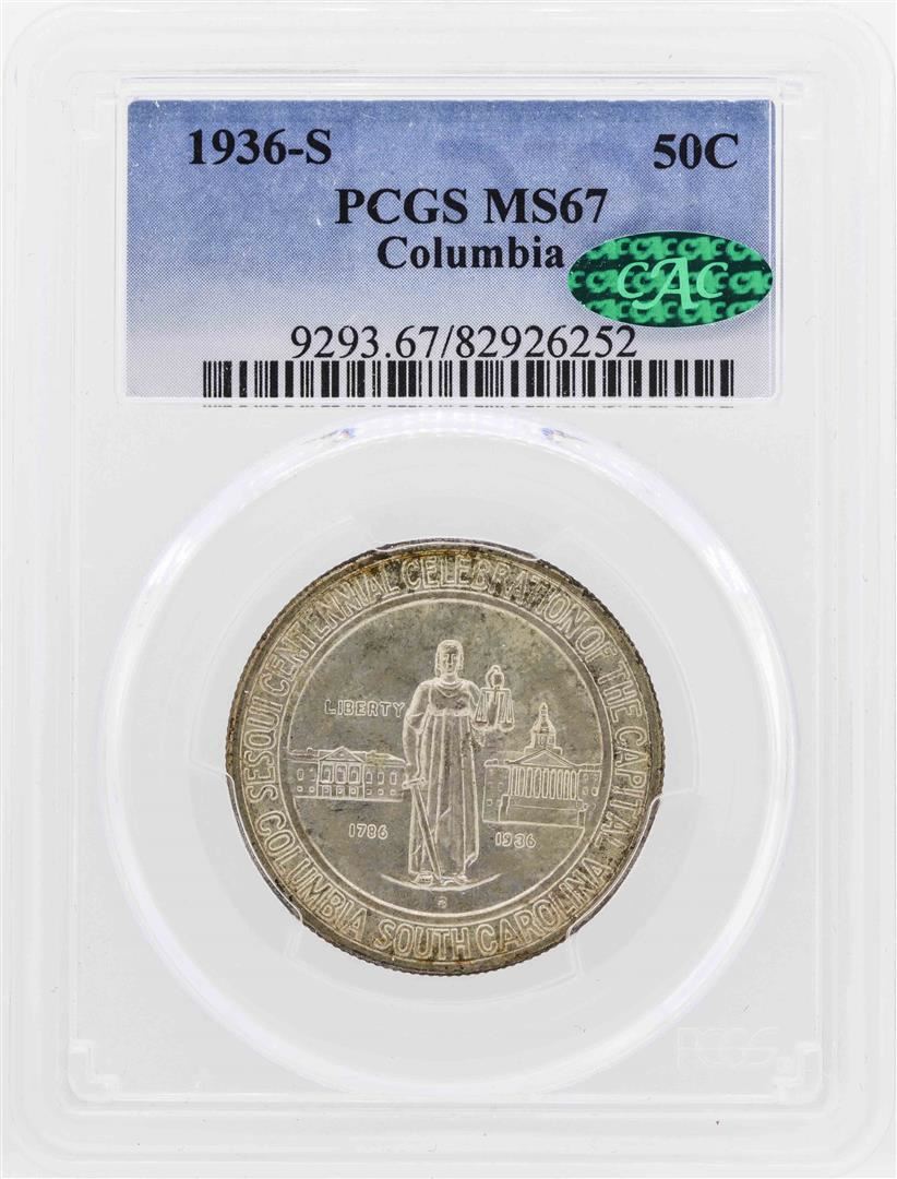 One 1936-S Columbia Sesquicentennial Commemorative Half Dollar Coin PCGS MS67 CAC. PCGS Graded.
