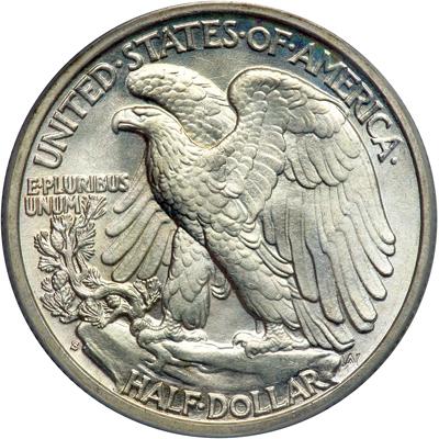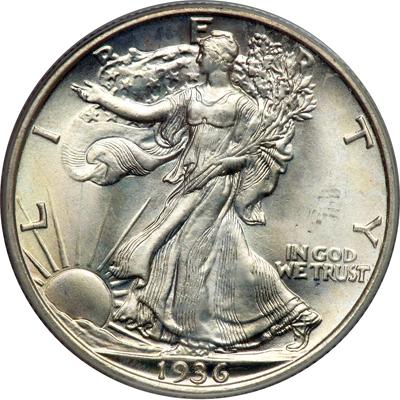 1936-S Liberty Walking Half Dollar. PCGS graded MS-65. A hint of light golden toning. A bold strike which is far sharper than normal for this (sometimes) weakly struck issue (PCGS # 6600).