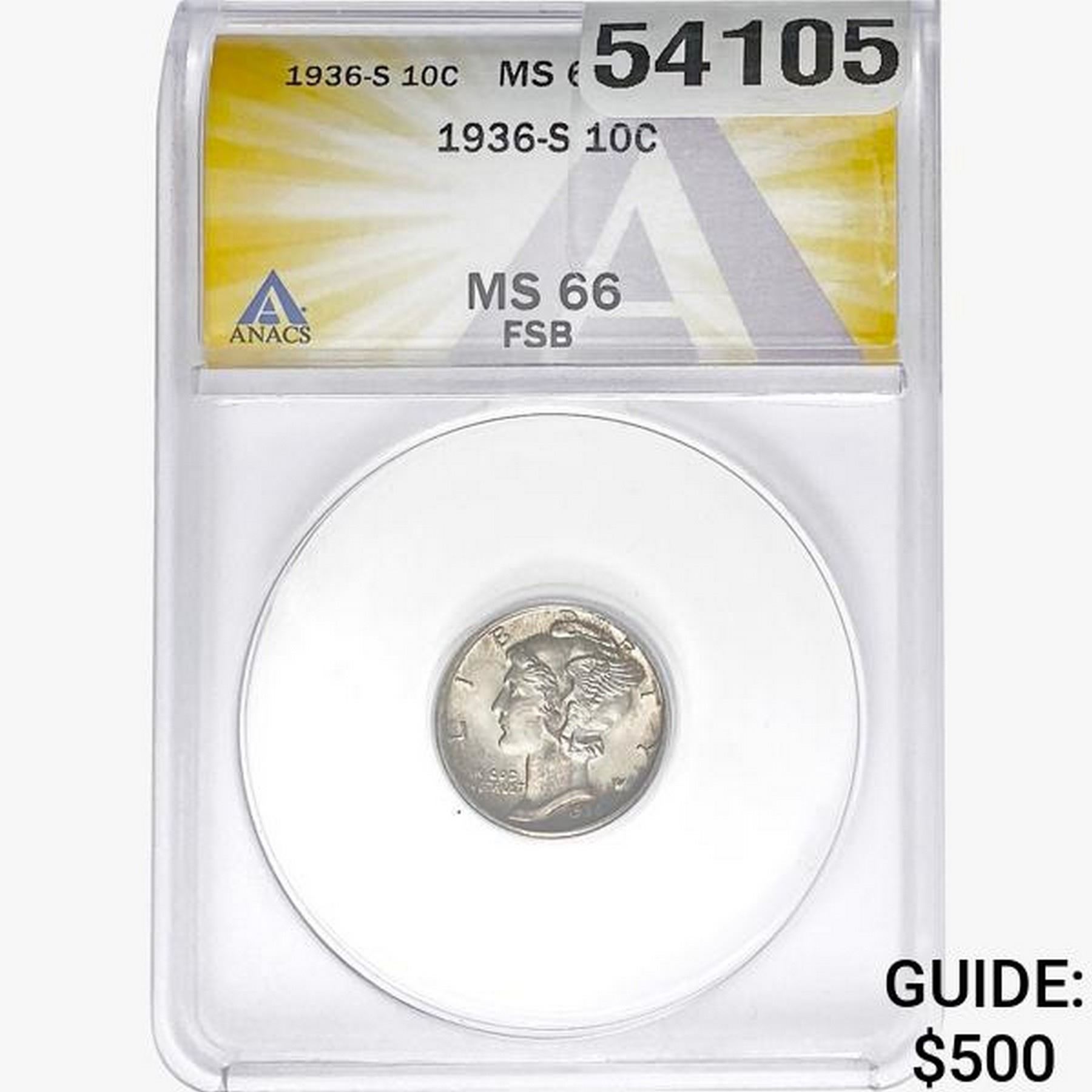 1936-S Mercury Silver Dime ANACS MS66 FSB