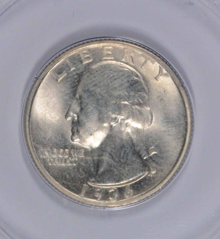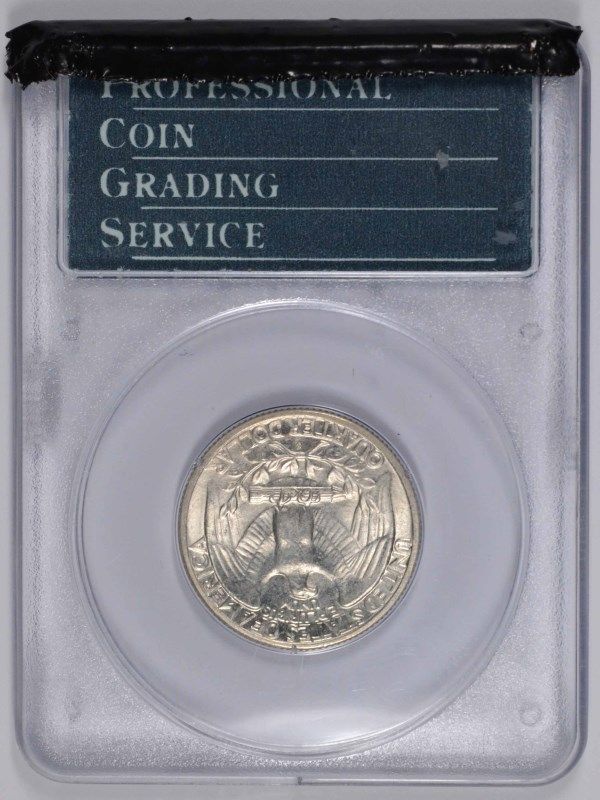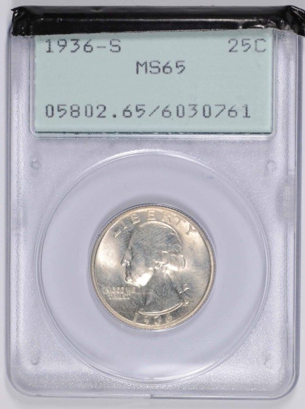 1936-S WASHINGTON QUARTER, PCGS MS-65 RATTLER HOLDER, TAPE ON TOP OF HOLDER