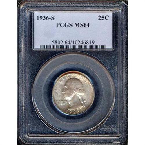 <b>1936-S Washington Quarter Dollar. PCGS graded MS64.</b> Choice with natural toning from years of careful storage <b>(PCGS # 5802)</b> <i>